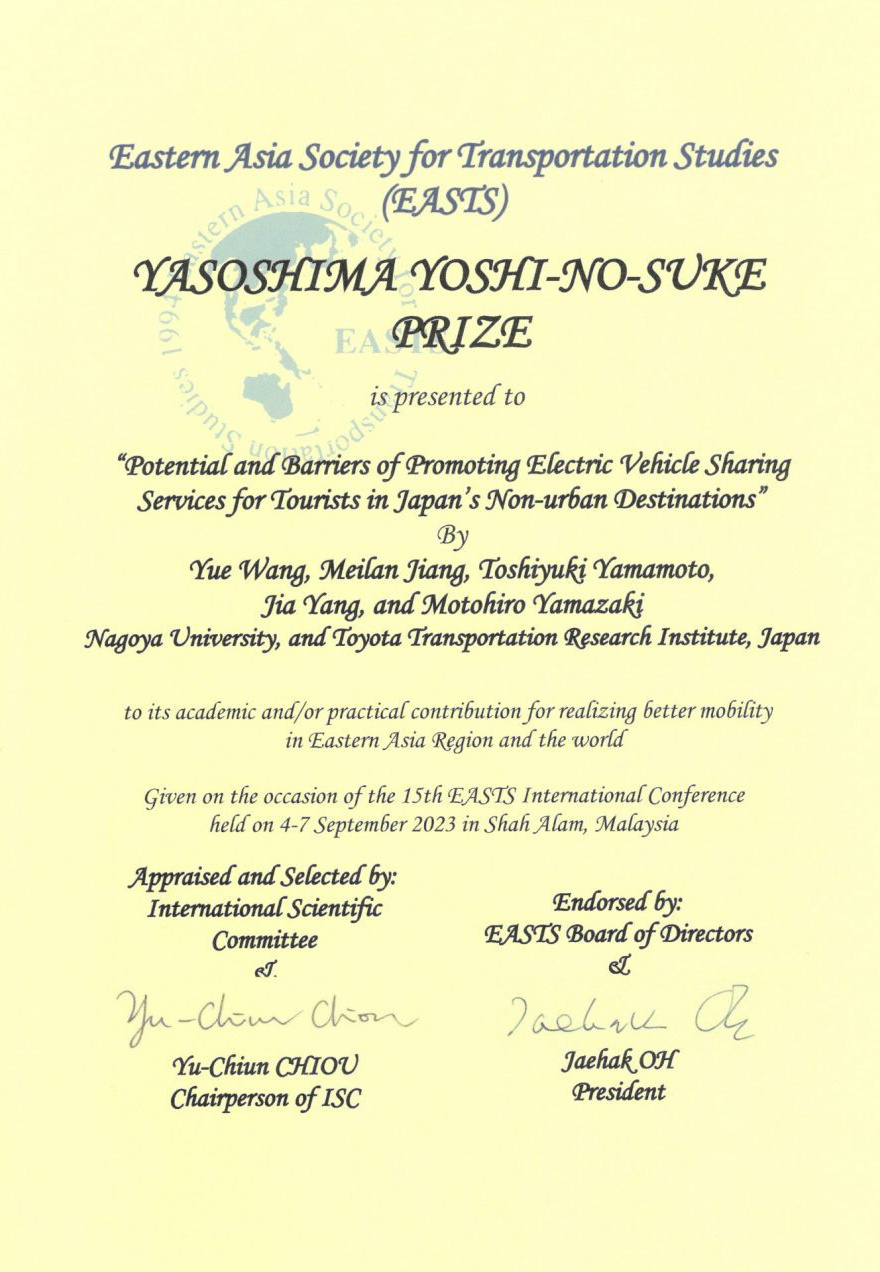 受賞者:Yue Wang (山本研・D2)、Meilan Jiang (未来社会創造機構・特任准教授)、山本俊行(教授)、Jia Yang(豊田都市交通研究所)、山崎基浩(豊田都市交通研究所)